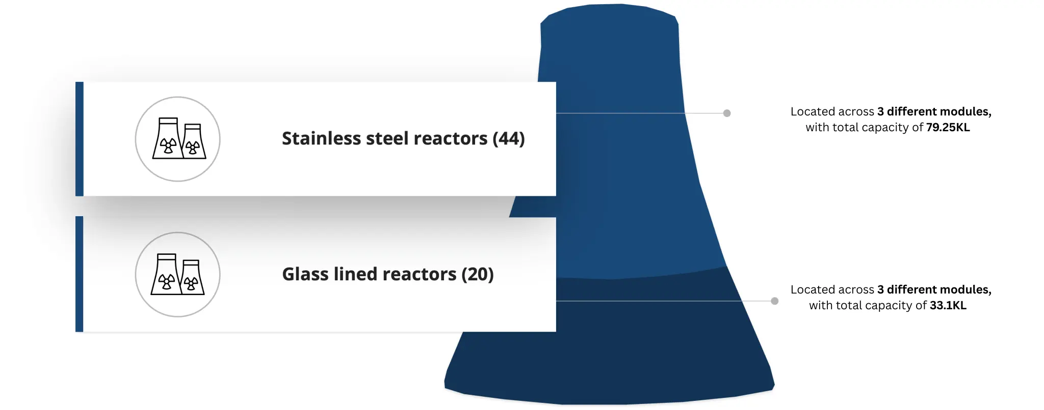 - Installed reaction capacity of 214,000 L with 68 reactors-31 SSR, 36 GLR, One Cryogenic reactor, ranging from 100 L to 8,000 L